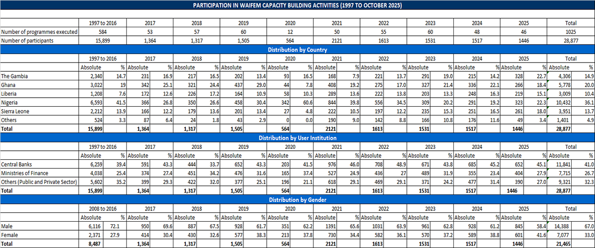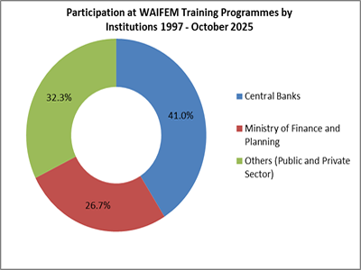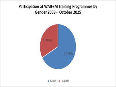 From 1997 to October 2025, WAIFEM made a total of 1025 capacity building interventions in pursuit of its mandate. Of these events, 917 or 89.5 percent represents knowledge and skills upgrading through training courses / workshop / seminars while 108 or 10.5 percent represents missions (needs assessment and follow-up) and other capacity building-related activities, such as progress review meetings and impact assessment surveys/studies. A total of 28,877 participants benefited from the programme.