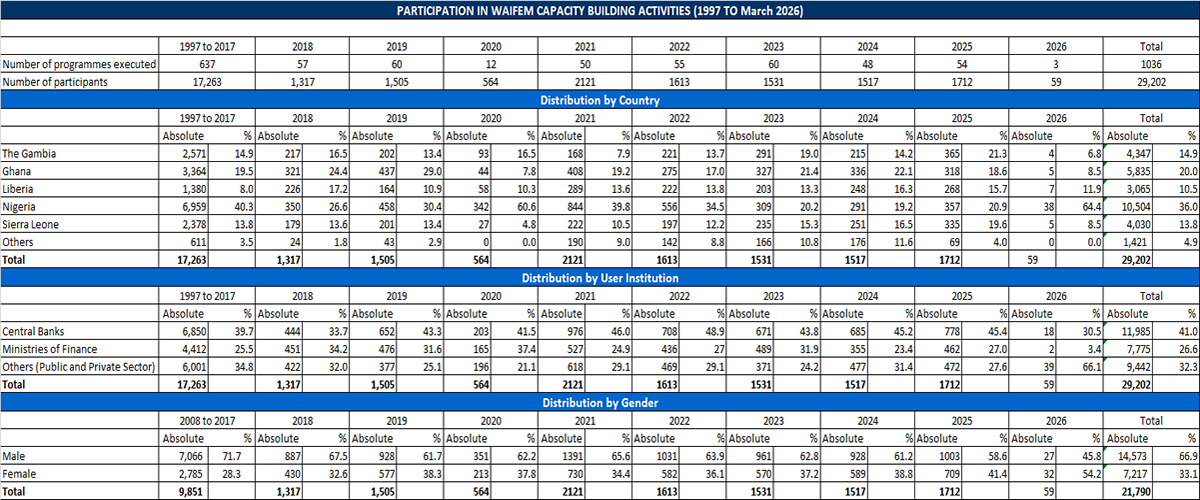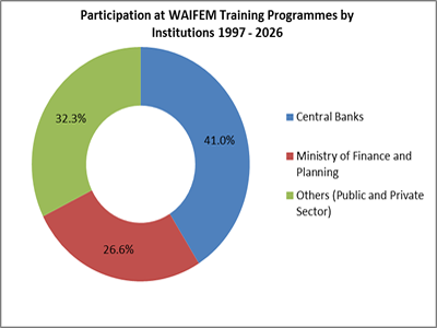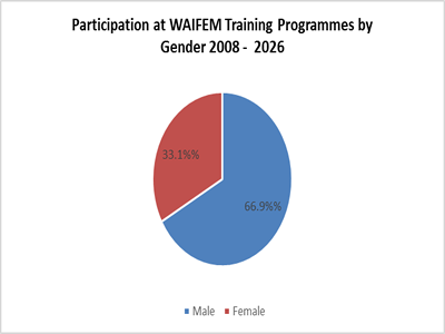 From 1997 to 2026, WAIFEM made a total of 1036 capacity building interventions in pursuit of its mandate. Of these events, 928 or 89.6 percent represents knowledge and skills upgrading through training courses / workshop / seminars while 108 or 10.4 percent represents missions (needs assessment and follow-up) and other capacity building-related activities, such as progress review meetings and impact assessment surveys/studies. A total of 29,202 participants benefited from the programme.